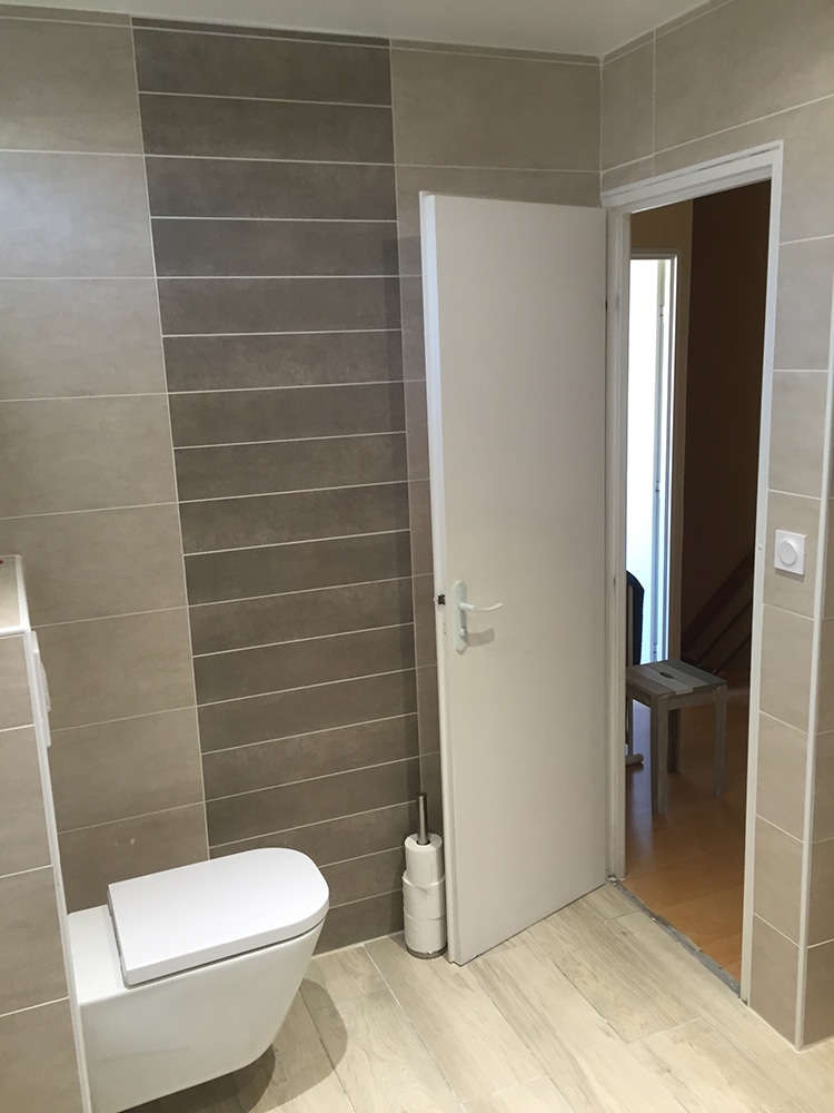 - Optimisation : Installation d’un meuble vasque fonctionnel et d’un WC suspendu pour épurer l’espace et faciliter l’entretien.